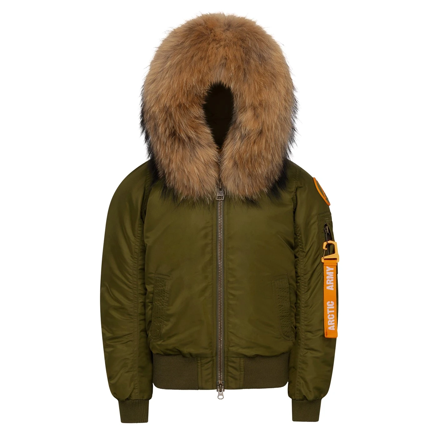 The Arctic Army parka is your new forever coat. Constructed from durable, smooth nylon twill, the timeless zip-through coat is filled with ‘Responsible Down Standard’ (RDS) fill and oversized Saga* fur hood trim for ultimate insulation. The women’s jacket can be tapered using the waistline drawstrings, whilst fleece-lined magnetic pockets and heavy rib cuffs add to unquestionable comfort to the piece. Arctic Army’s soldier beetle badge sits on the left sleeve above the utility pocket with signature flight jacket tag.