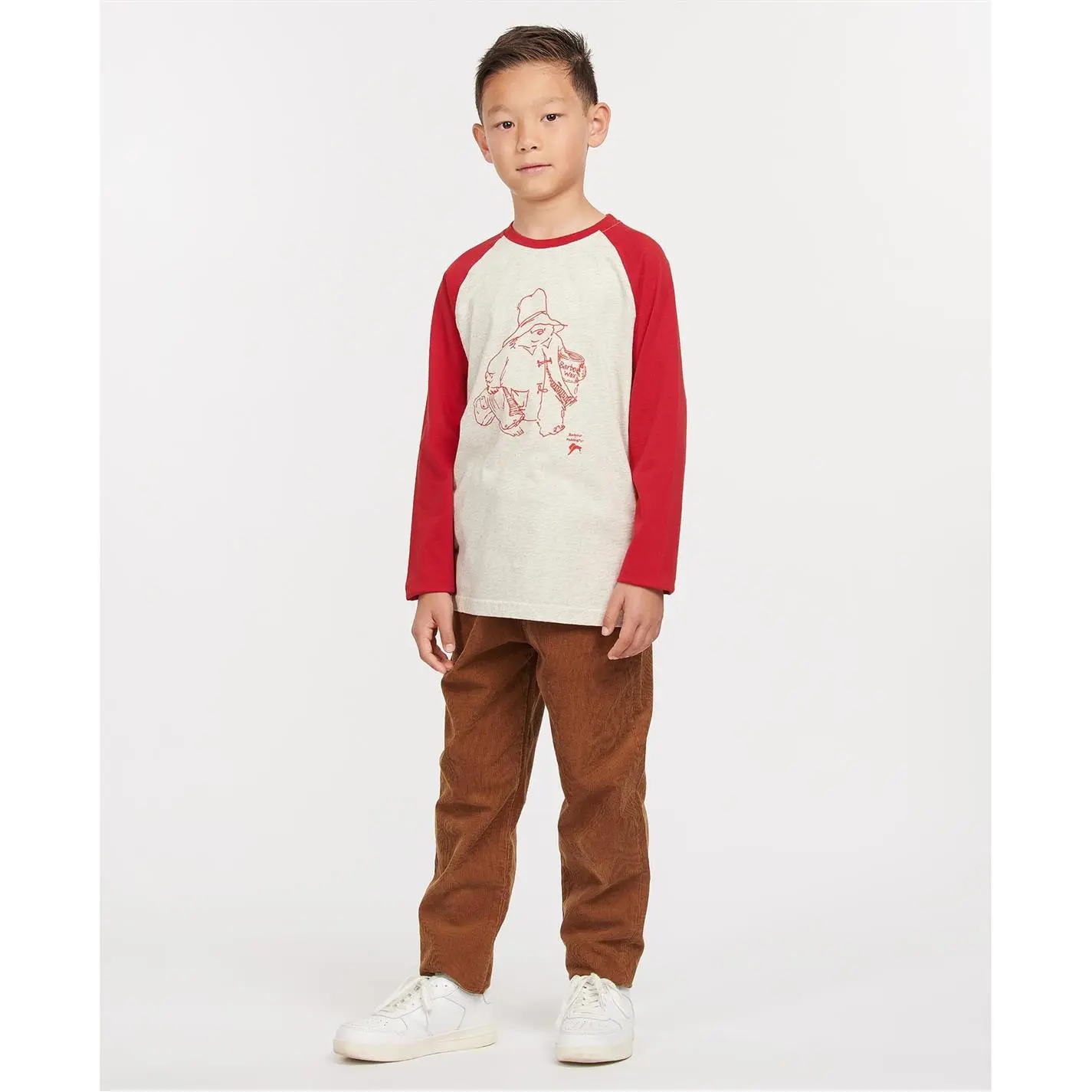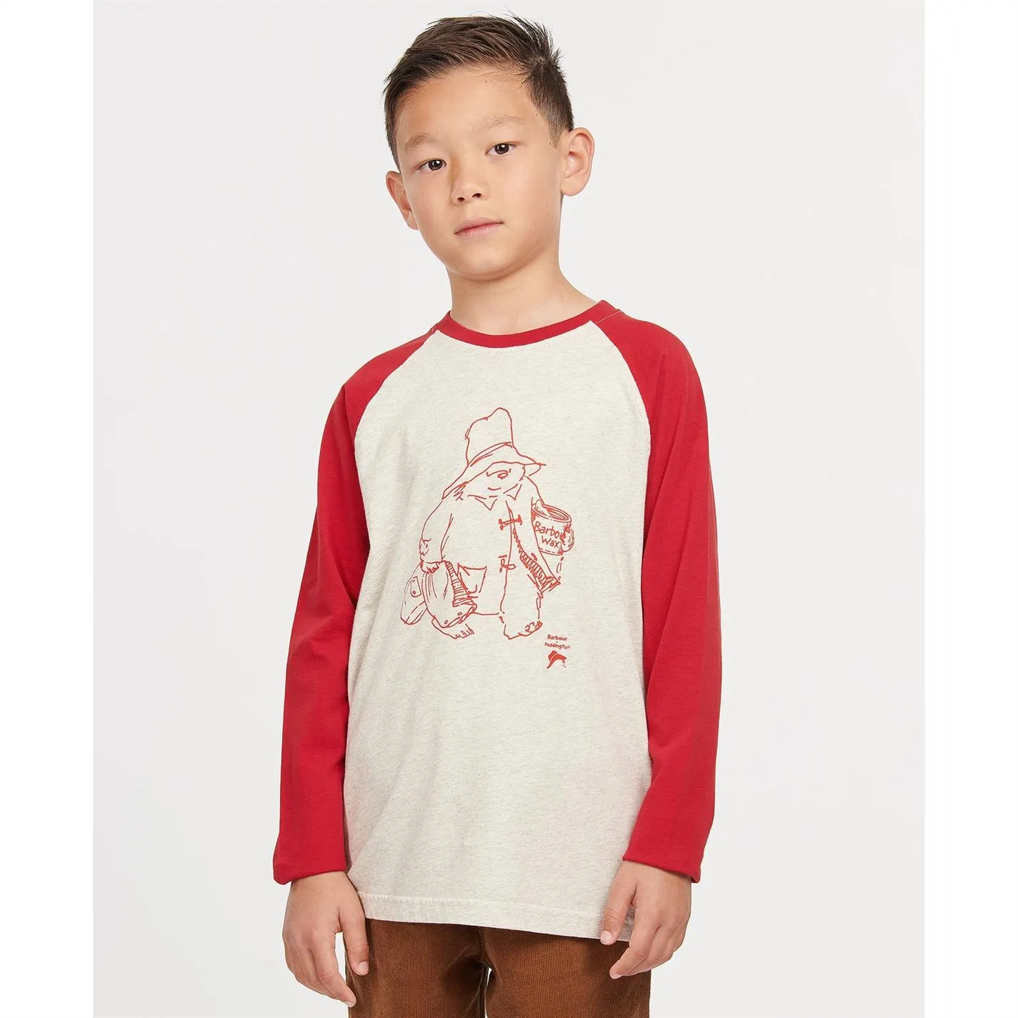 The Barbour Boys Paddington Contrast T-Shirt showcases a sweet Christmas graphic to the chest. With contrast sleeves and neckline, this t-shirt shows Paddington and his Barbour wax for a playful combination.