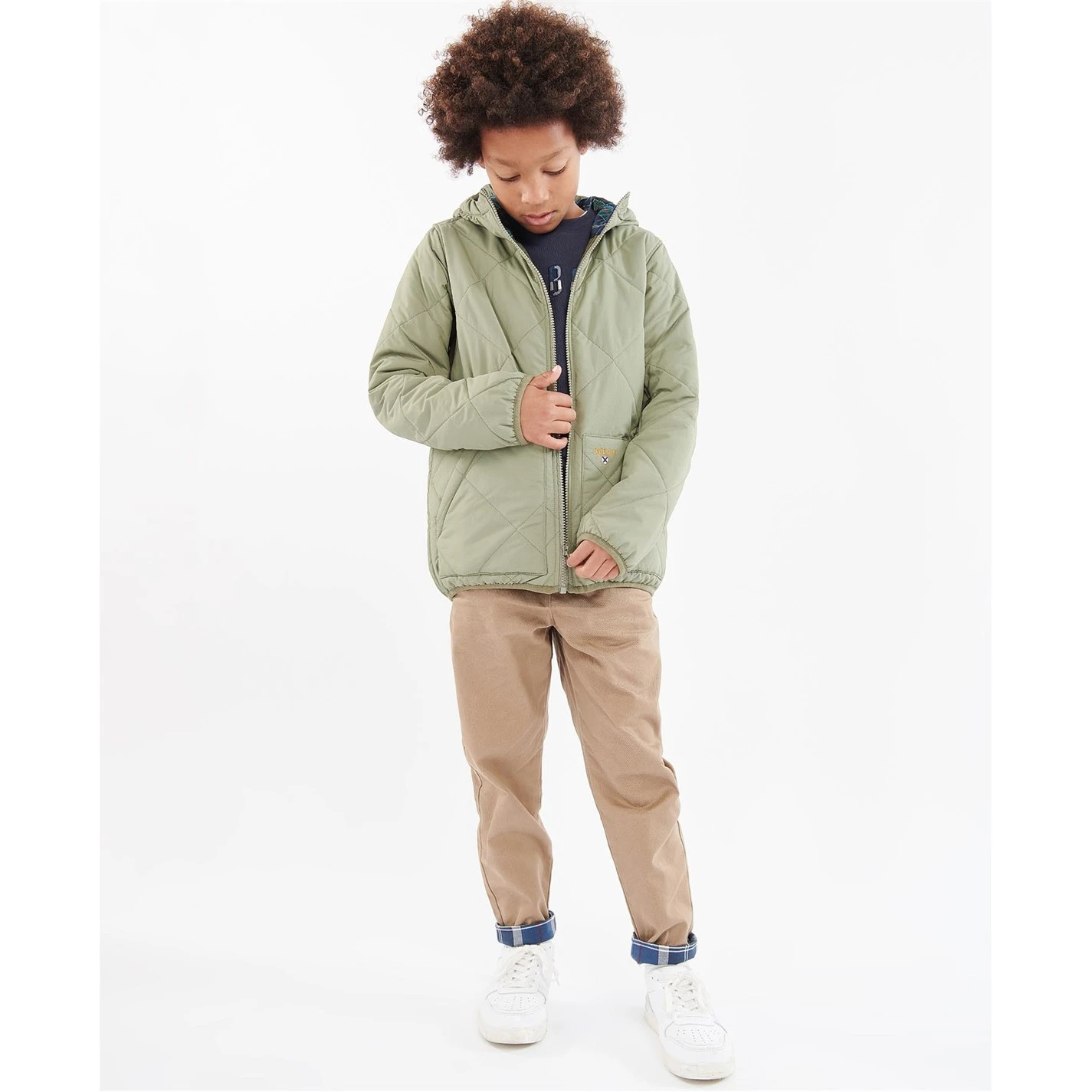 The Barbour Boys Quibb Quilted Jacket features a fixed hood and zip front fastening for added protection against the unpredictable weather. Showcasing two lower patch pockets and a tartan lining, this jacket adds a smart yet functional layer to your little one’s collection.