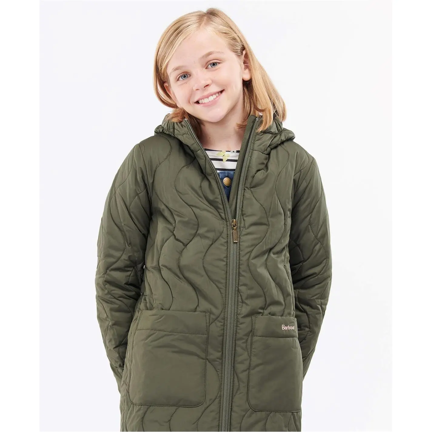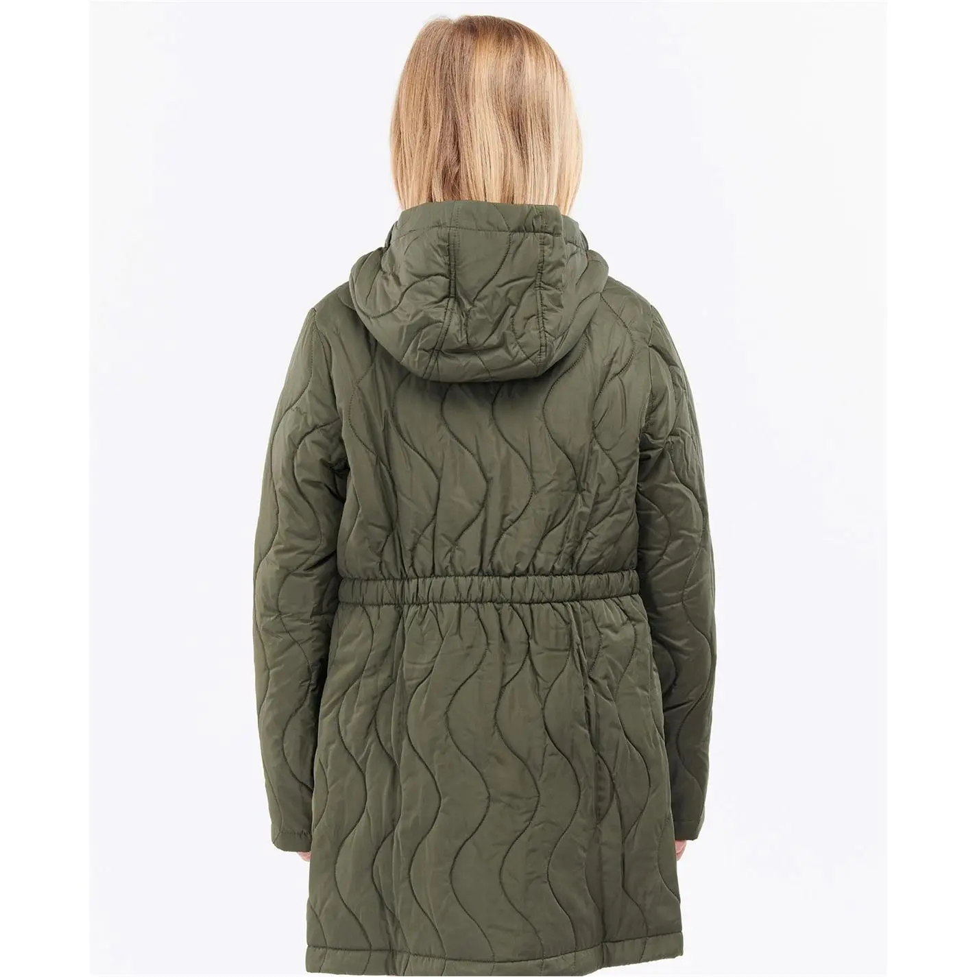 The Barbour Guilden Quilted Jacket boasts a longer lenth style in a new veritcal wave quilted design. Showcasing a grown on hood and large patch pockets, this style is lined in a sweet floral print.