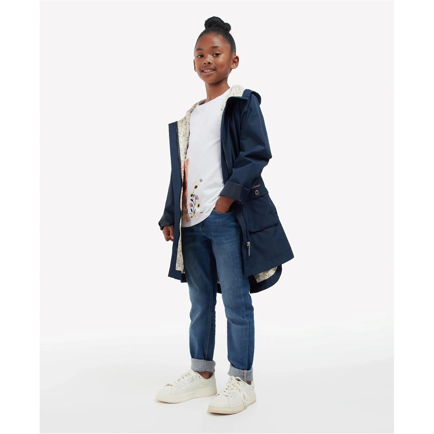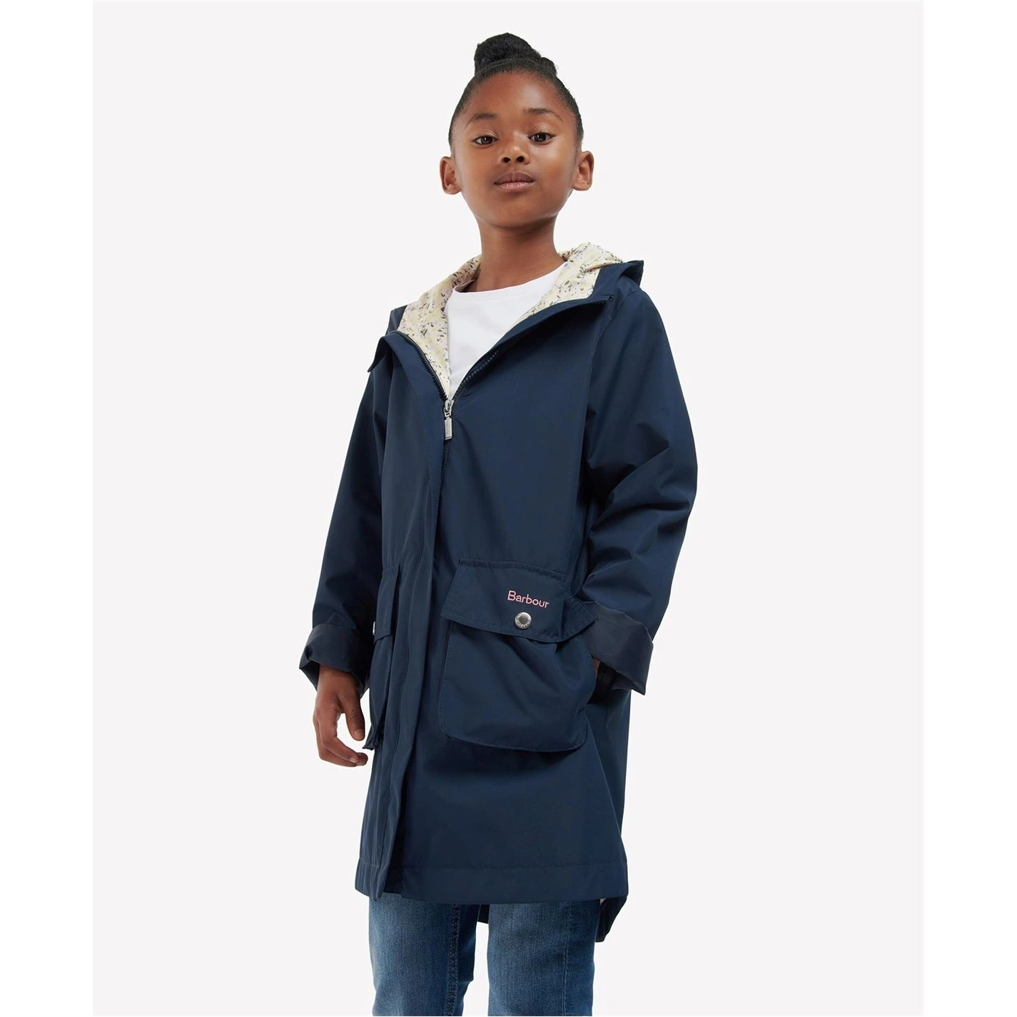 This Barbour showerproof jacket features a snug hood and a front zip fastening to keep little ones warm. This style is designed with a lightweight feel, printed lining and large front pockets for handy storage space. Kids will love this garment worn over sweatshirts and with jeans this season.