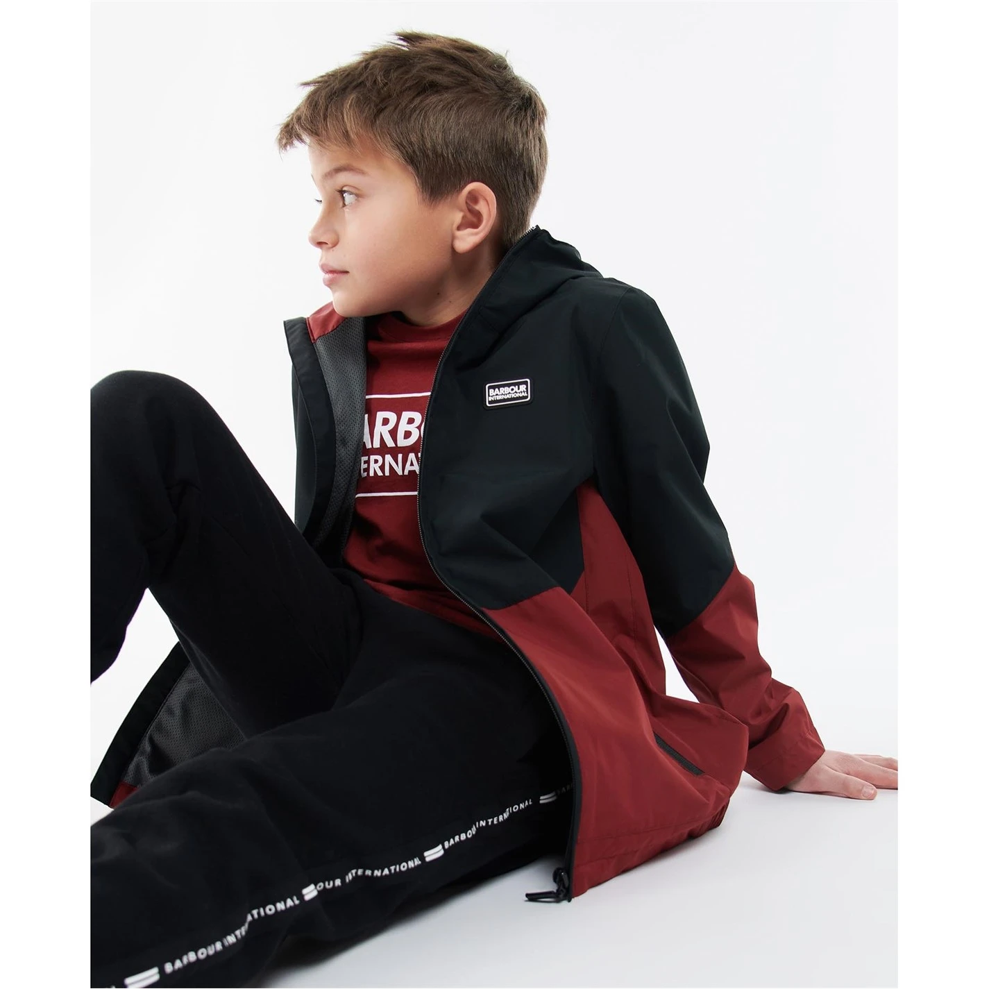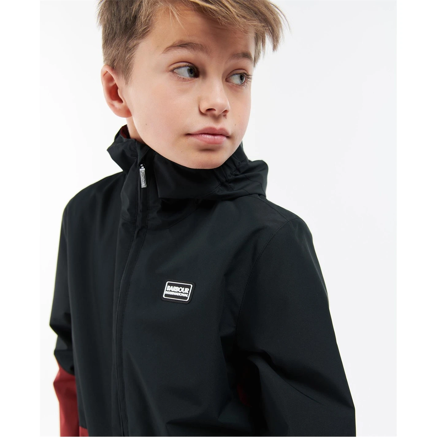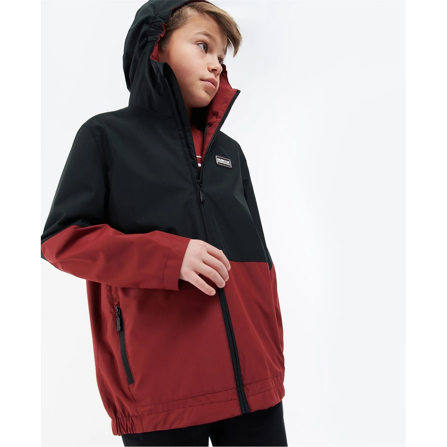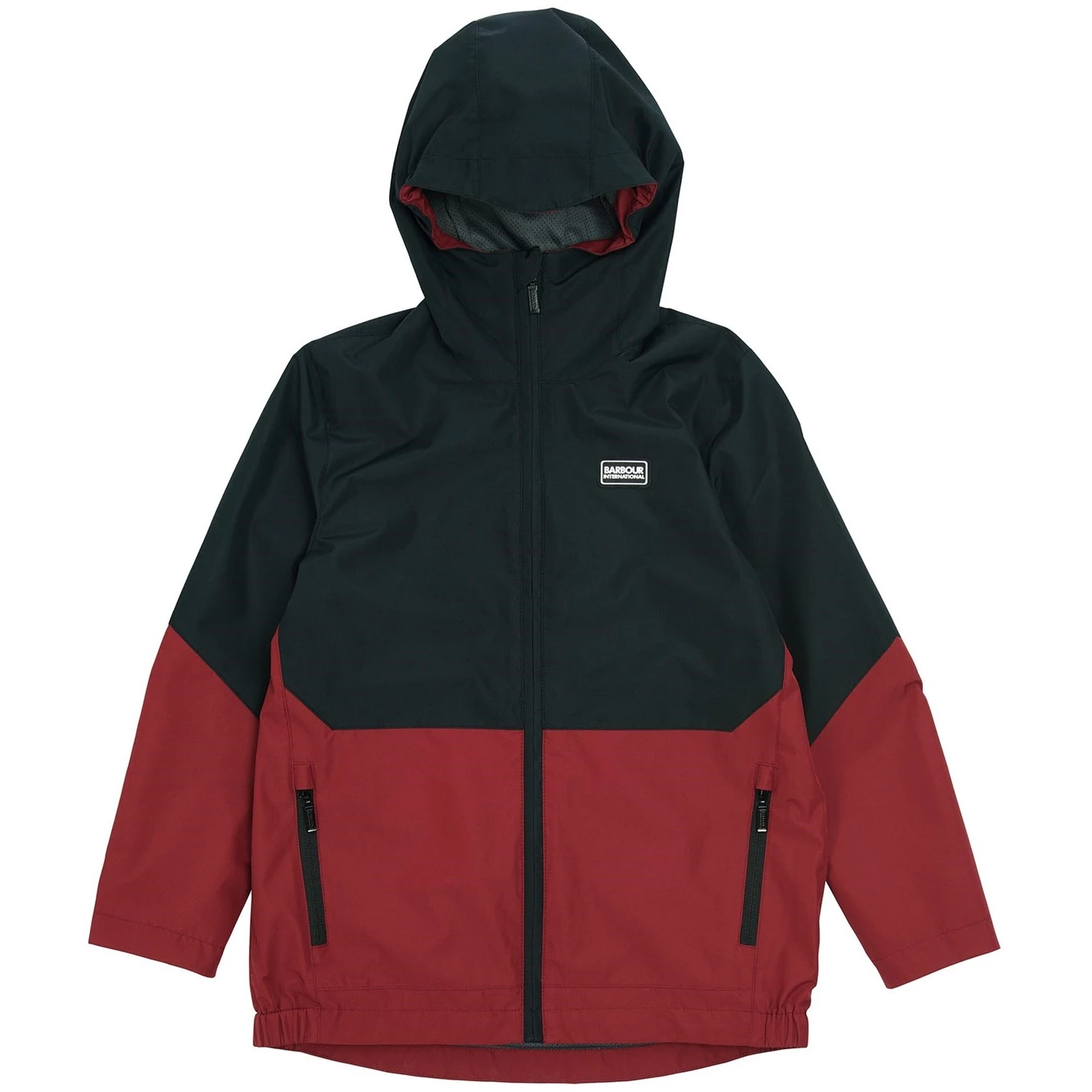 The Barbour International Boys Paxton Showerproof boasts a colour block design with a fixed hood and zip front fastening. This style showcases lower side entry pockets with zip fastenings and has a mesh lining.