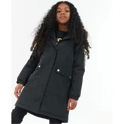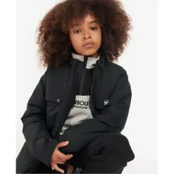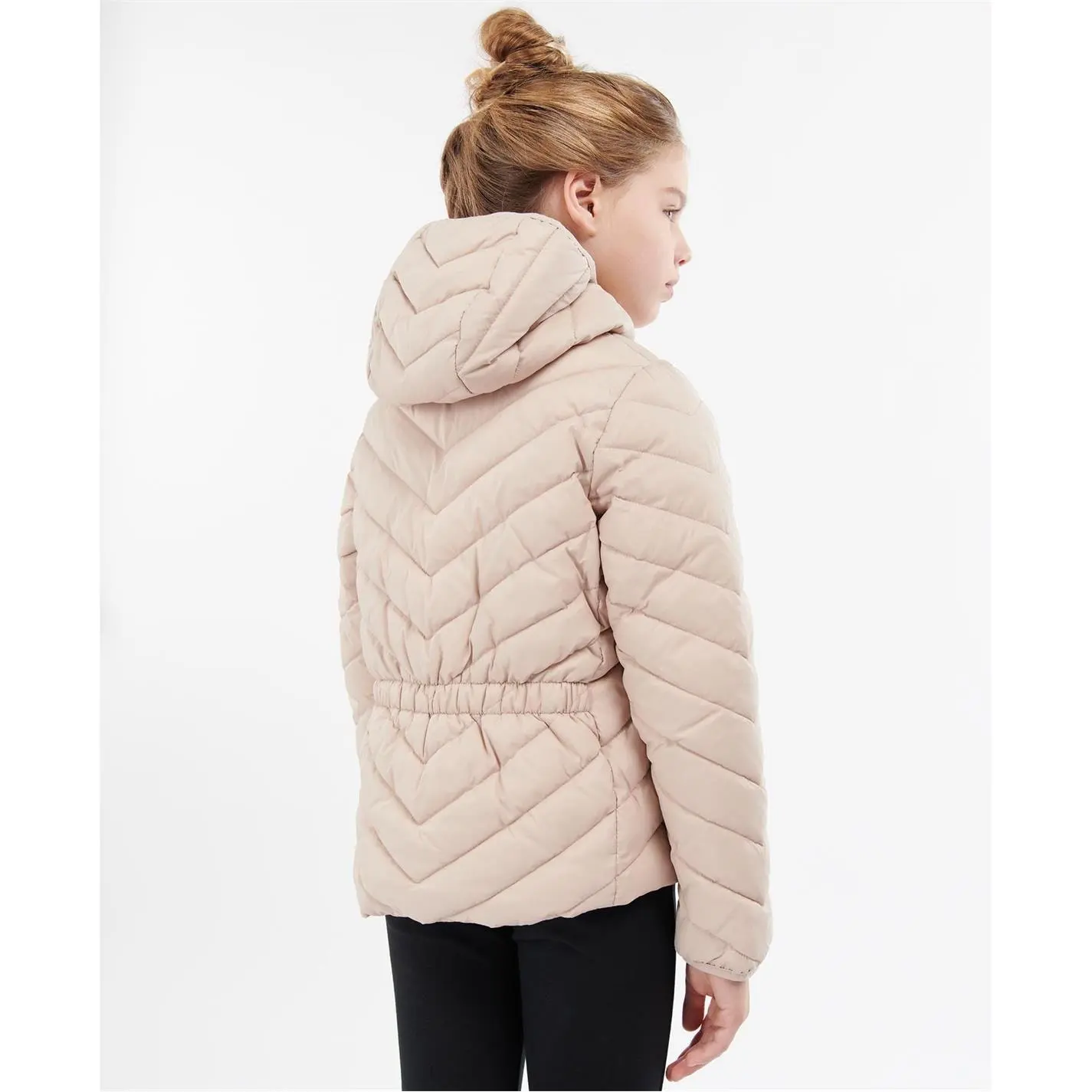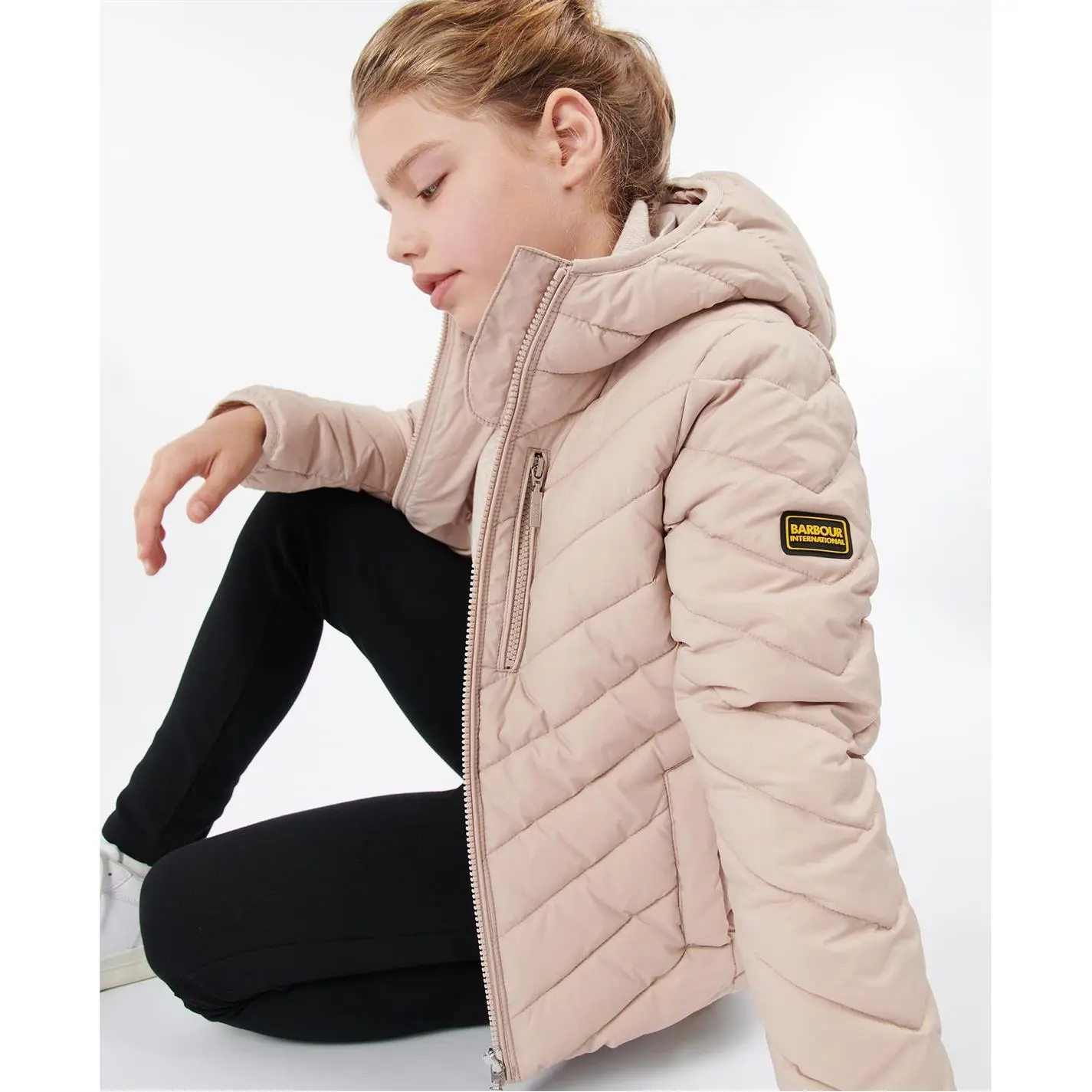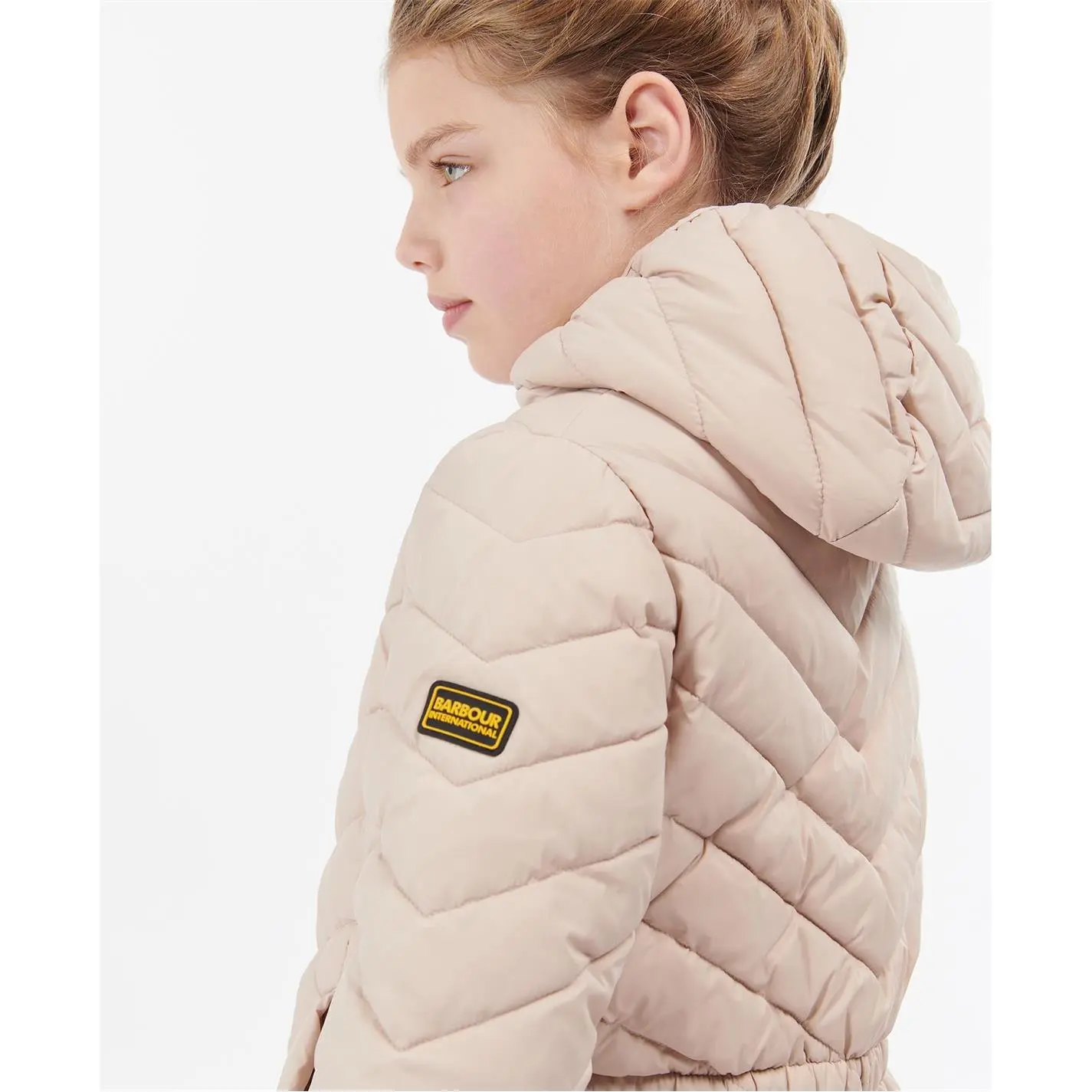 Boasting an all over baffle design, the Barbour International Girls Silverstone Quilted Jacket boasts concealed stud welt pockets with a zip chest pocket detail. Featuring stretch binding to the hood for the perfect fit, this jacket is finished with a branding to the left sleeve.