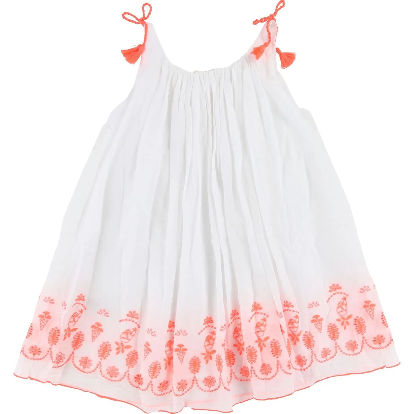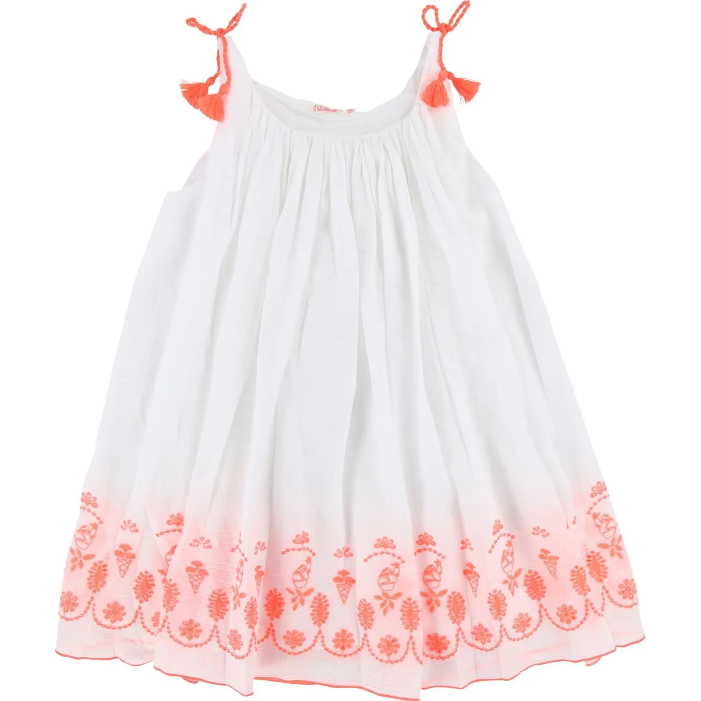 Lend a delightful dose of modernity to your little girl`s casual wardrobe with this dress by Billieblush. Made from a soft cotton fabric, this sleeveless profile features gathered detailing on the round neckline for a sweet and comfortable wear. Decorated with eyelet embroidery trims on the hem and bow embellishments on the shoulders for a charming appeal, this day dress teams well with sandals and a matching hairband for a cute outfit.