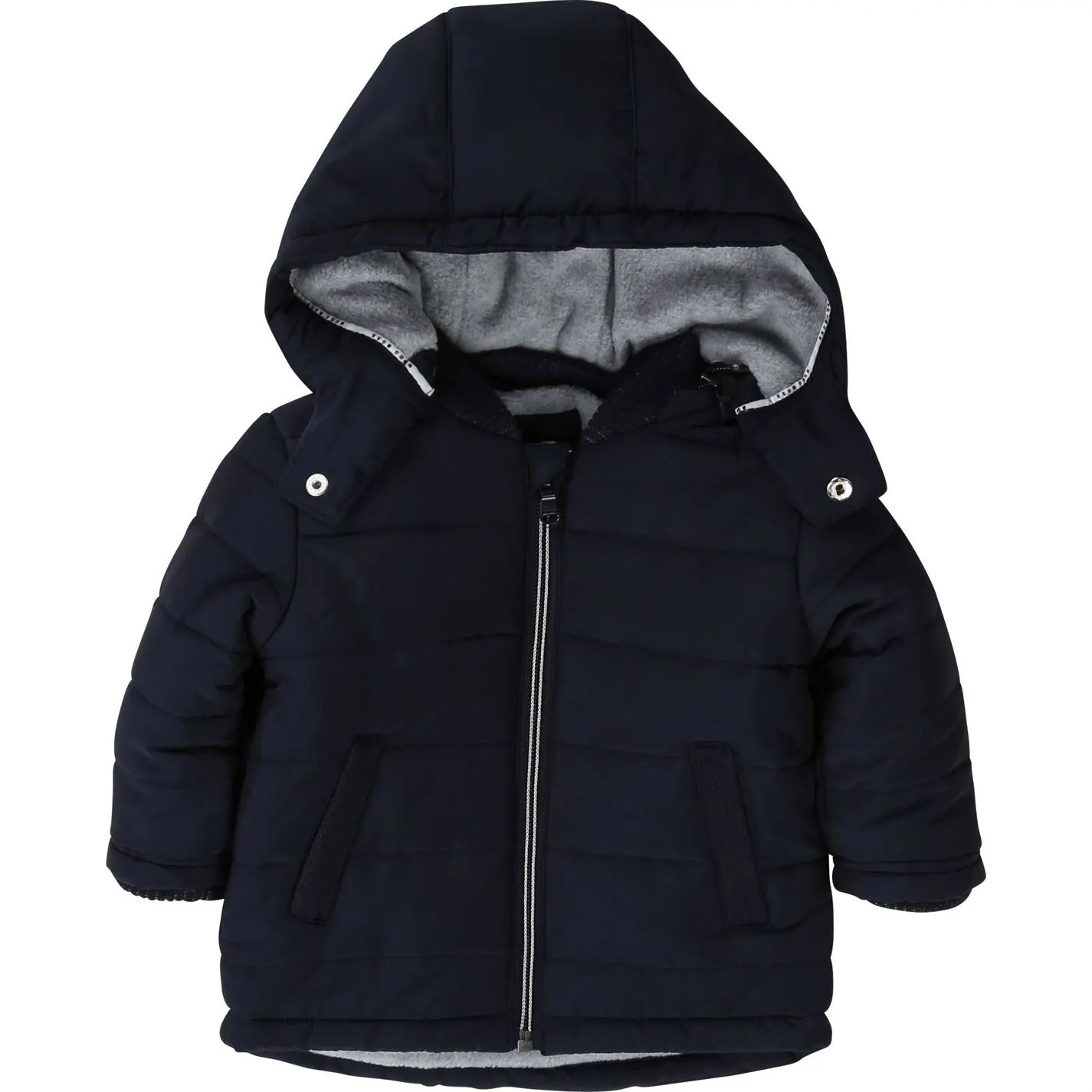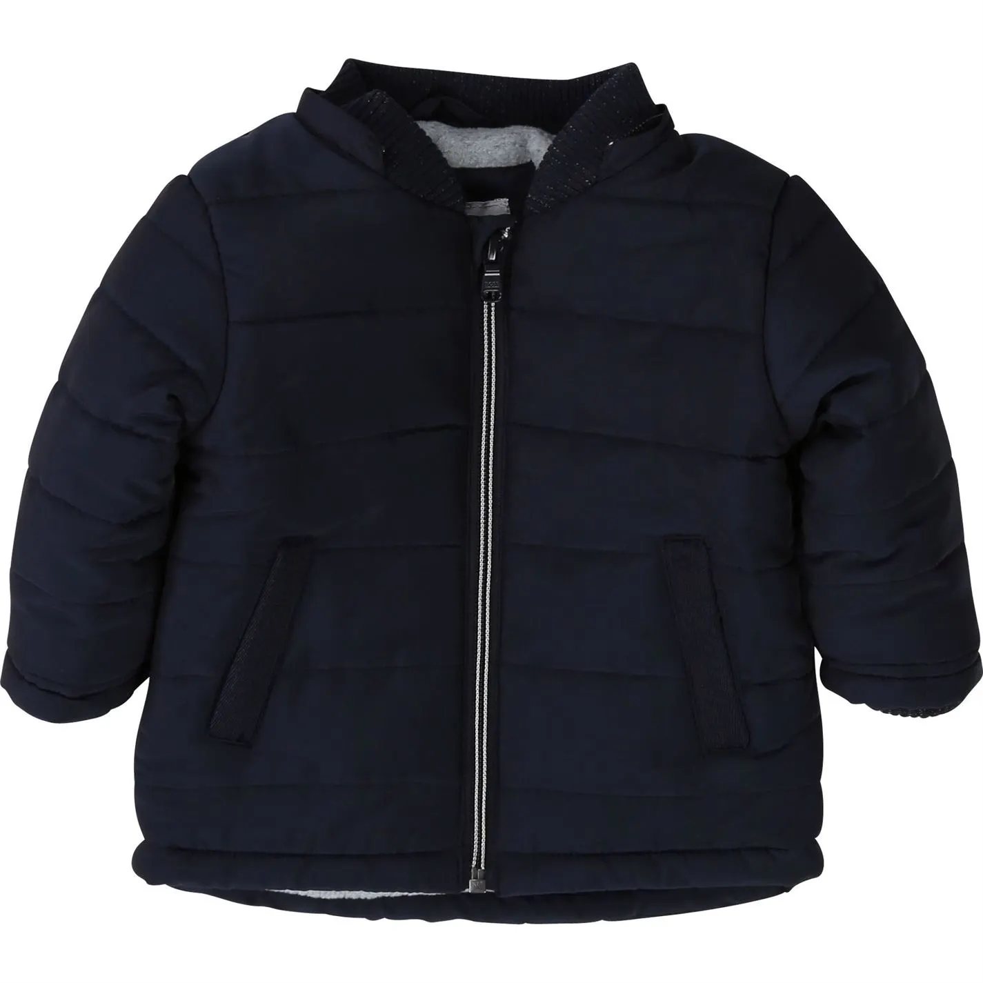 Keep your baby boy warm and protected during his escapades with this puff jacket by Boss. Crafted from a lightweight fabric, this long-sleeved profile boasts of front zip closure and an attached hood for convenience. Equipped with two pockets at the waist, this padded jacket is complete with the signature logo at the back. Layer this over a t-shirt and pair of pyjamas for a stylish look for the season.