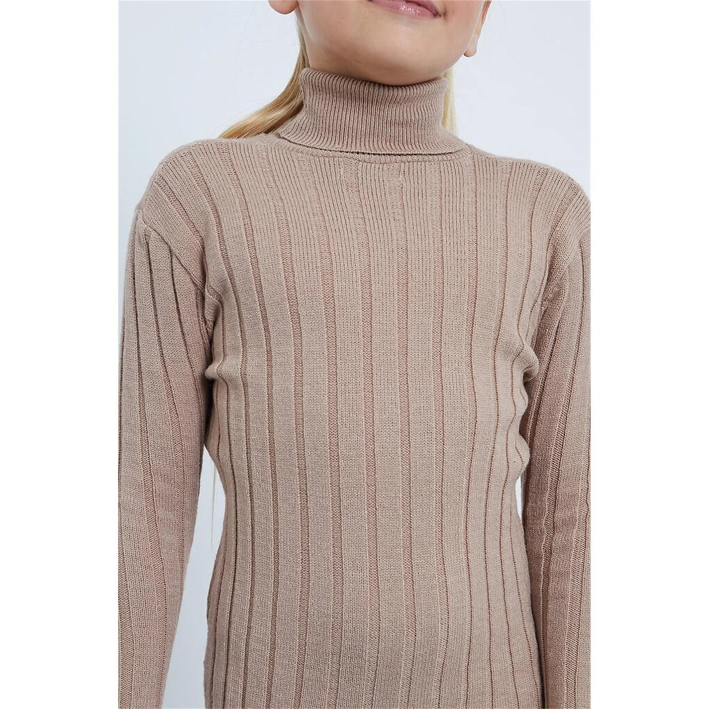 Childrens dress in a knitted finish, featuring a roll neckline and long sleeves in a mini length.