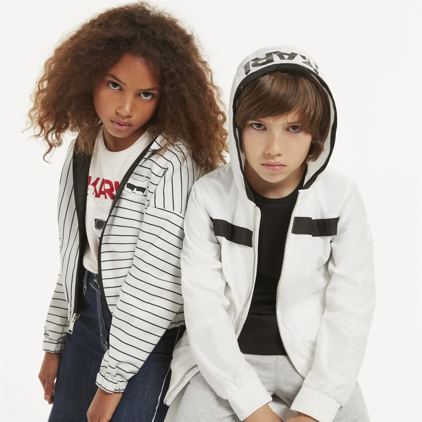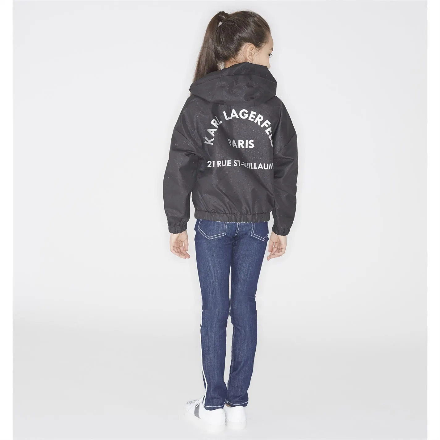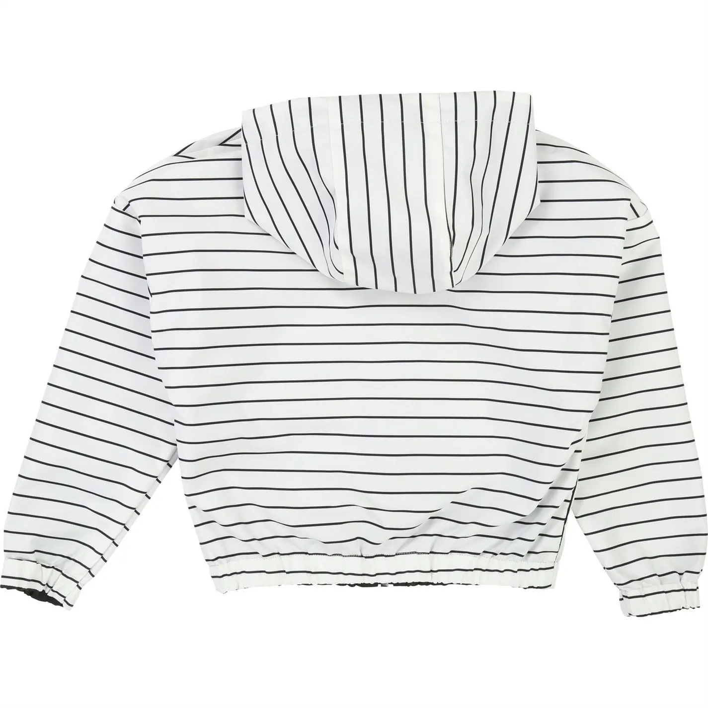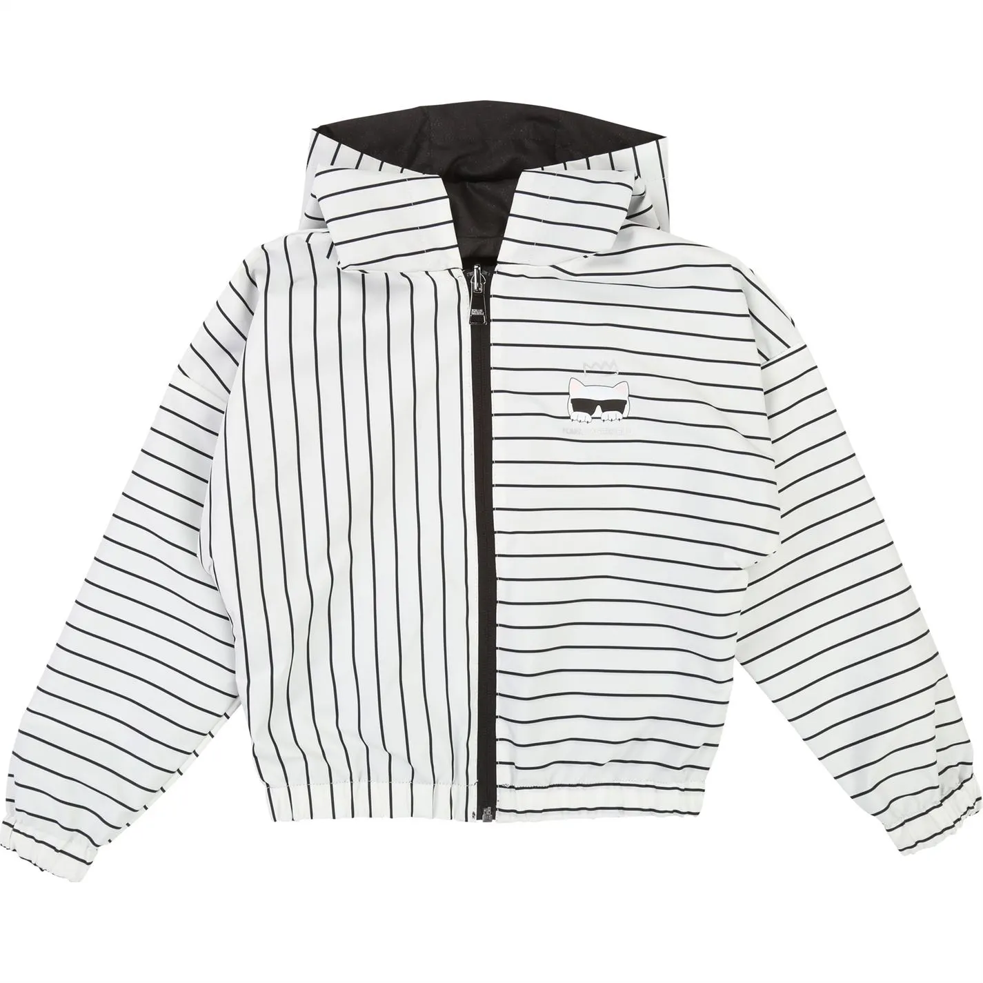 Reversible hooded jacket : a striped side with printed Choupette+logo on the front / a plain side with pockets and silver logo on the back, repellent, zip fastener.
