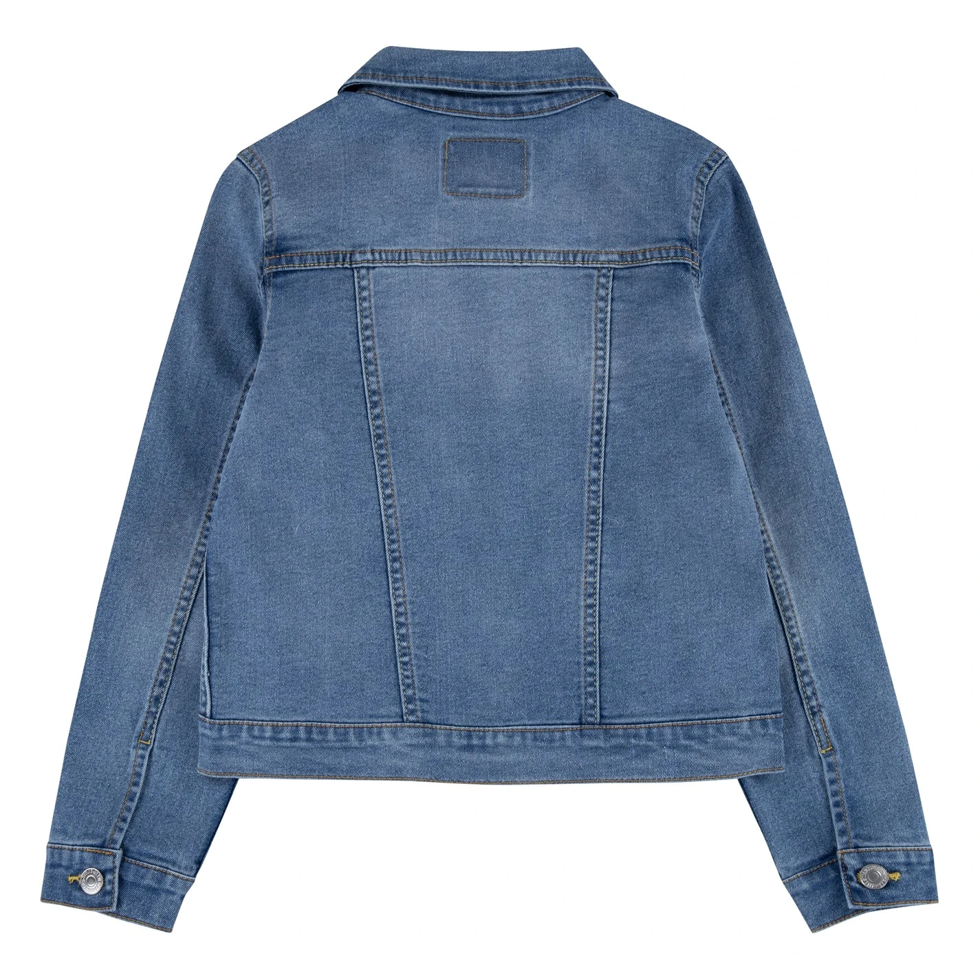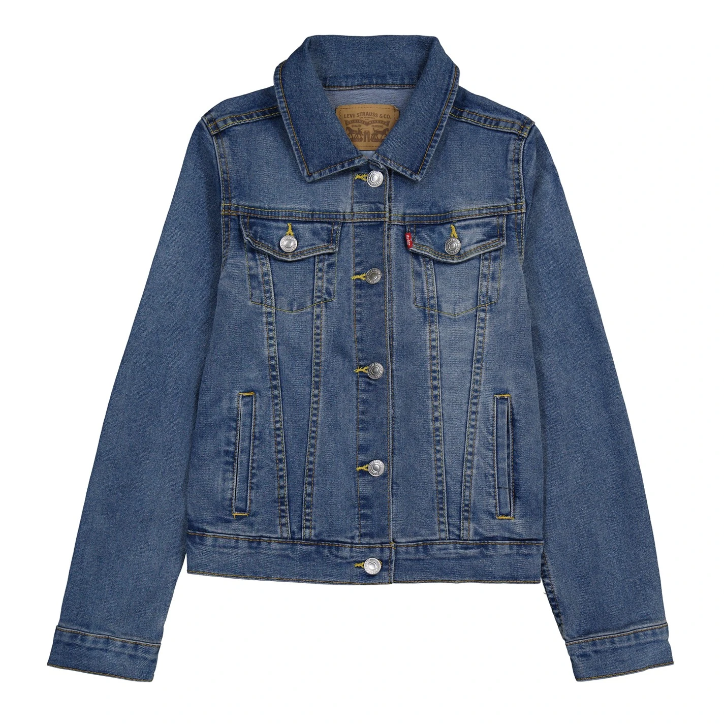 Elevate your little girls outwear with the Denim Trucker Jacket by Levis, crafted from pure cotton for a premium denim finish. Complete with two chest pockets, a press stud fasten and traditional collar for the ultimate look. Signature Levis red tab branding delivers the finishing, designer touch.