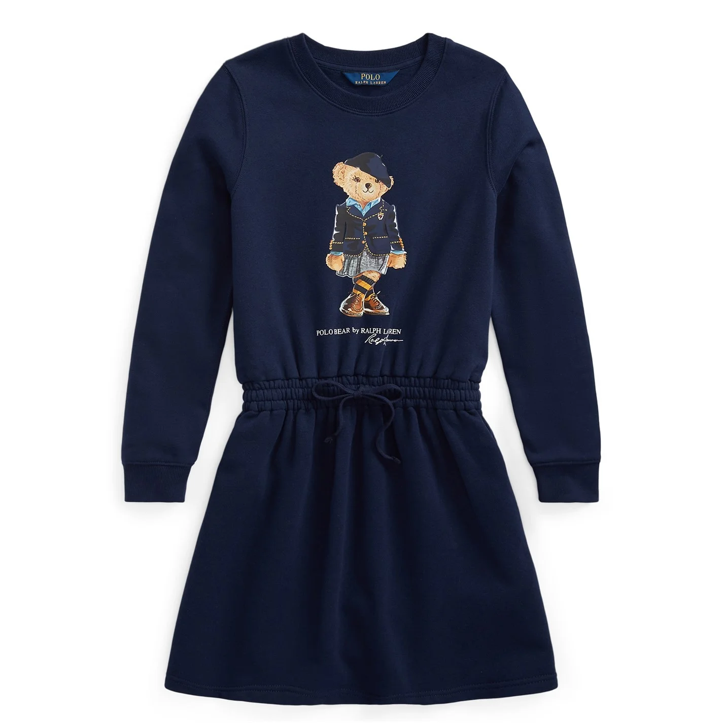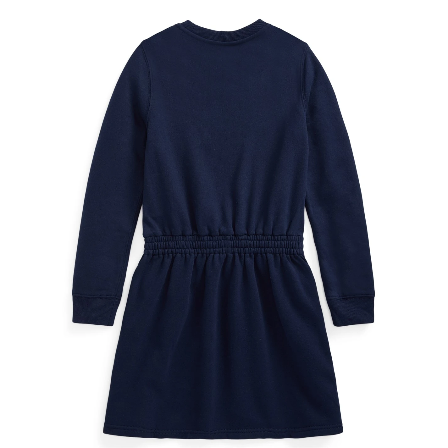 This cute, comfortable dress by Polo Ralph Lauren is made from lightweight, peached fleece and features the beloved Polo Bear in a prep school inspired look. It features a drawstring waistband and side on-seam pockets for practicality. Size medium has a 29 body length (front and back) and a 26 sleeve length. Sleeve length is taken from the center back of the neck.