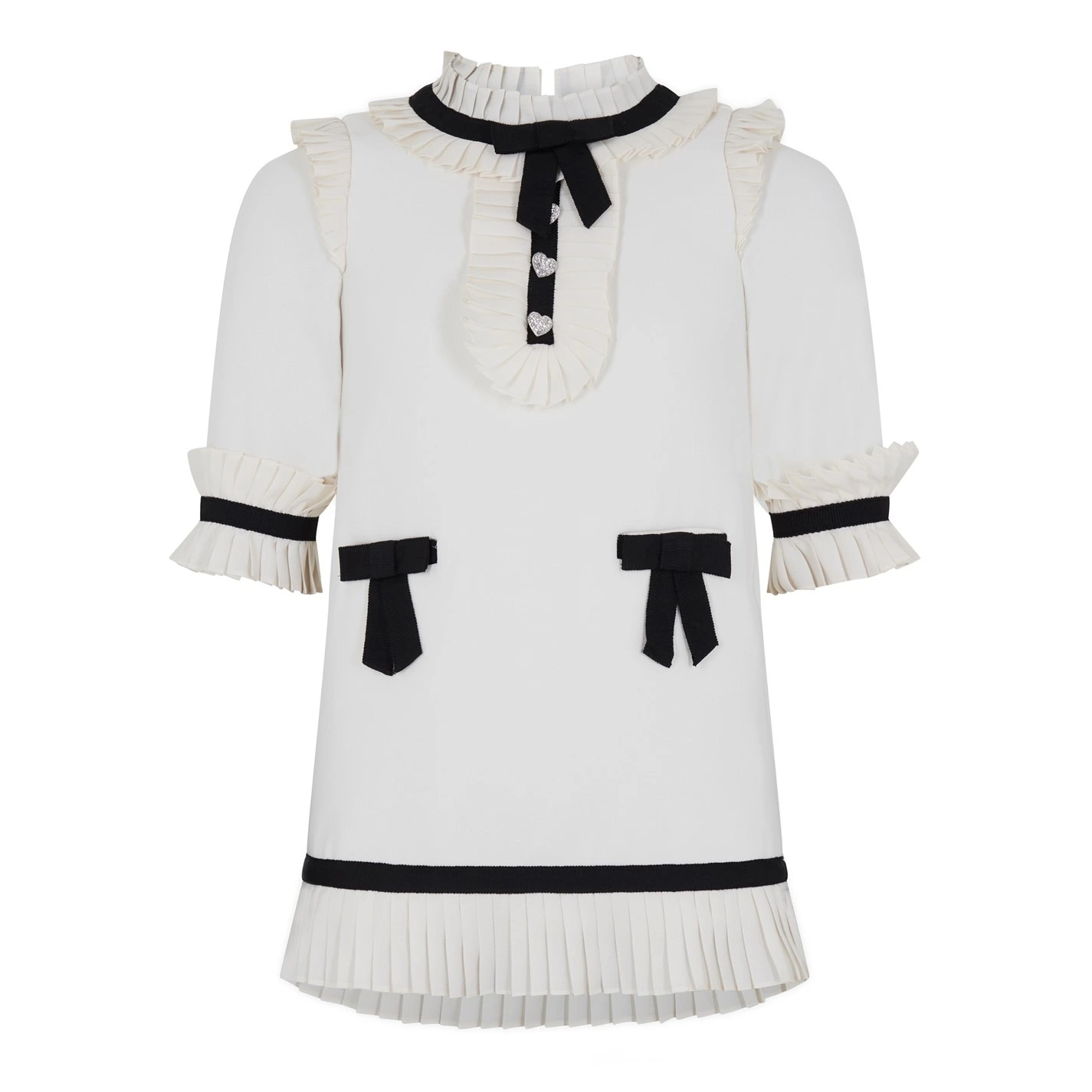 The Embellished Crepe Mini Dress by Self Portrait is the perfect for your little one’s special occasions. Crafted from a heavy crepe constructed in a relaxed silhouette and features pleats on the hems and front, contrasting bows, short sleeves, and finished with heart-shaped jewelled buttons adorned to the front.