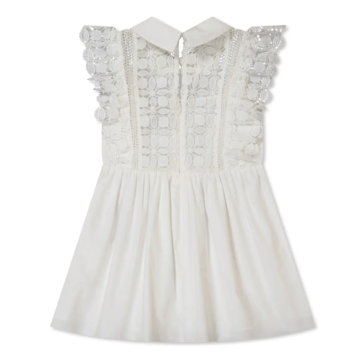 This signature Self Portrait white lace dress is the perfect, preppy piece to add to your mini me’s wardrobe. It’s point collar paired with its ruffled sleeves add an elegant edge to the dress. It’s a-line skirt is pretty and practical with its side seamed pockets and keyhole fastening with a back zip for ease of wearing. Made from a soft poplin, the floral lace bodice adds a final girly touch..