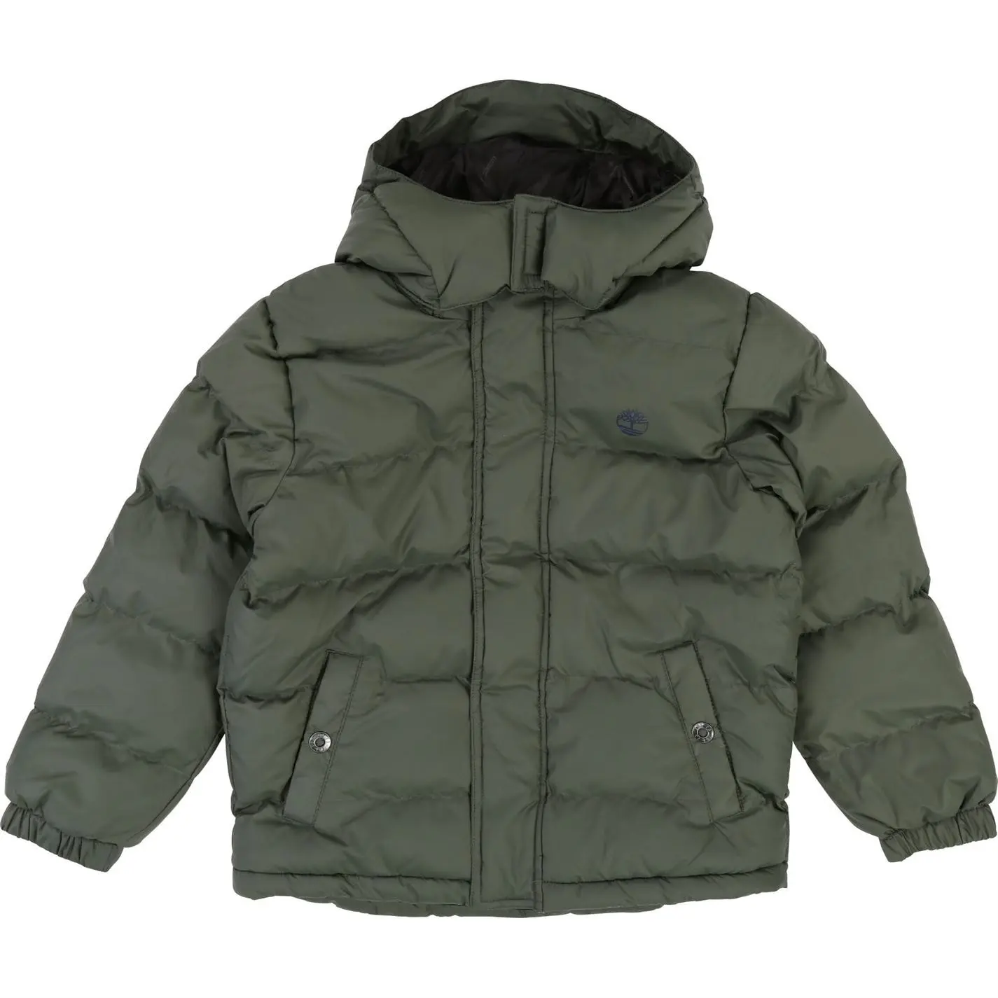 Water-repellent coated nylon removable hooded puffer jacket, Timberland printed nylon lining, cotton-wool padding, polar details, Yellow Boot lace + Timberland logo.