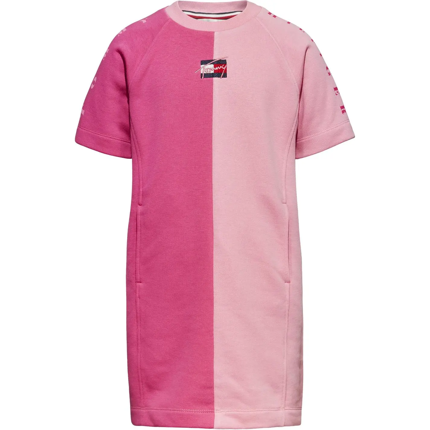 Update your little one’s staples with the tommy Hilfiger Two Tone Sweater Dress. Styled in a relaxed silhouette, this midi length dress has been crafted from a soft fabrication boasting a two toned pink design. Branded with Tommy Hilfiger embroidered logo to the chest and a printed graphic down the short sleeve, this dress features a crew neckline and two slip pockets for a sporting aesthetic.